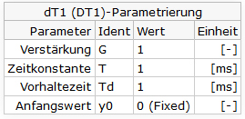 - Der Block uDot wird vorgeschaltet. Weiterhin wird ein Funktionsblock f1 mit f1.F := self.x ins Modell gelegt. Der Ausgang f1.y wird direkt auf den Eingang uDot.u gelegt. Weiterhin wird ein DT1-Block dT1 (SignalBlocks.Linear.DT1) instanziiert und nach unten stehender Tabelle parametriert.