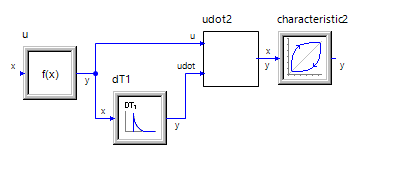 Am Eingang dT1.x liegt f1.y an, der Ausgang dT1.y wird auf uDot1.udot gelegt. Mit dieser Variante ist es möglich, nur den Eingang f1.x beim Code-Export nach außen zu gegeben; die Ableitung wird intern berechnet.